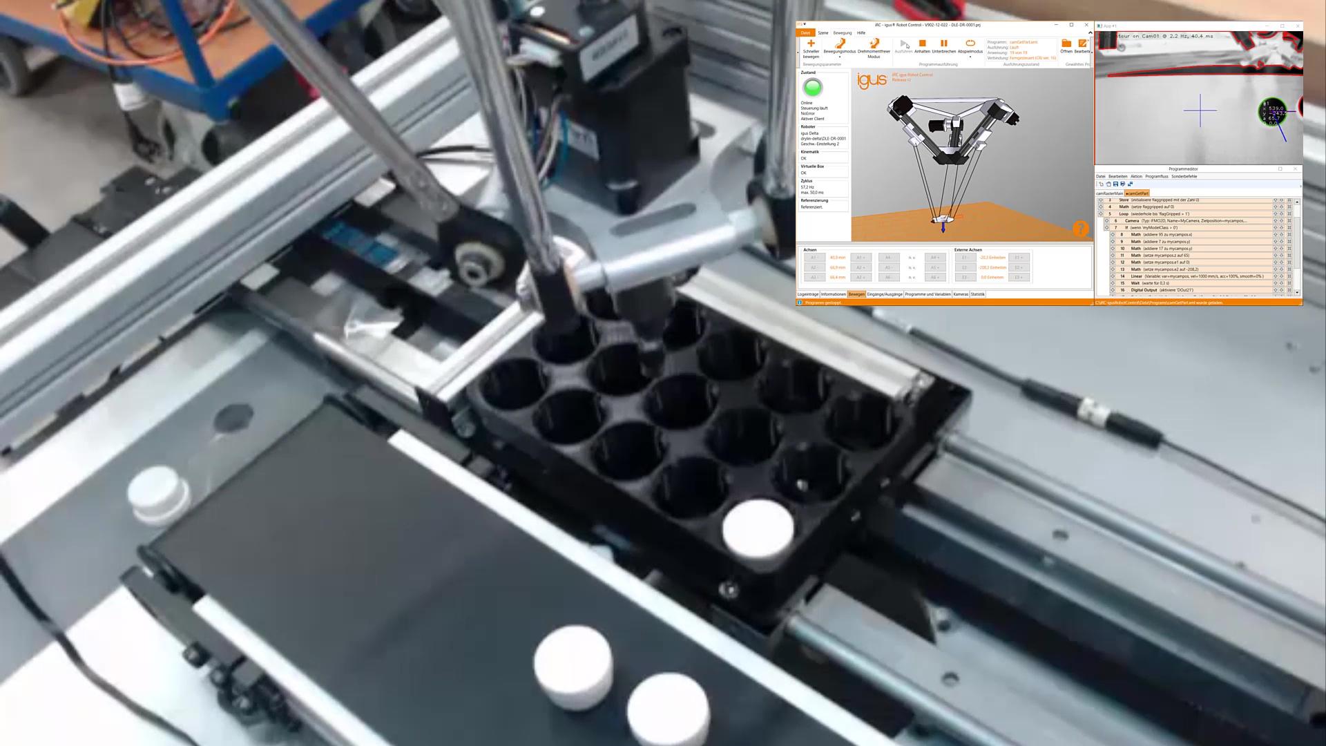In this application, an igus delta robot transfers small cans from a moving conveyor belt into a designated box. Equipped with a camera system, the robot identifies the exact position of the cans in real-time, ensuring precise handling even when the cans are not uniformly aligned on the belt. This setup eliminates the need for additional alignment processes, increasing efficiency and flexibility in production workflows. The system is ideal for industries requiring fast and consistent material handling, such as food and beverage or packaging operations.